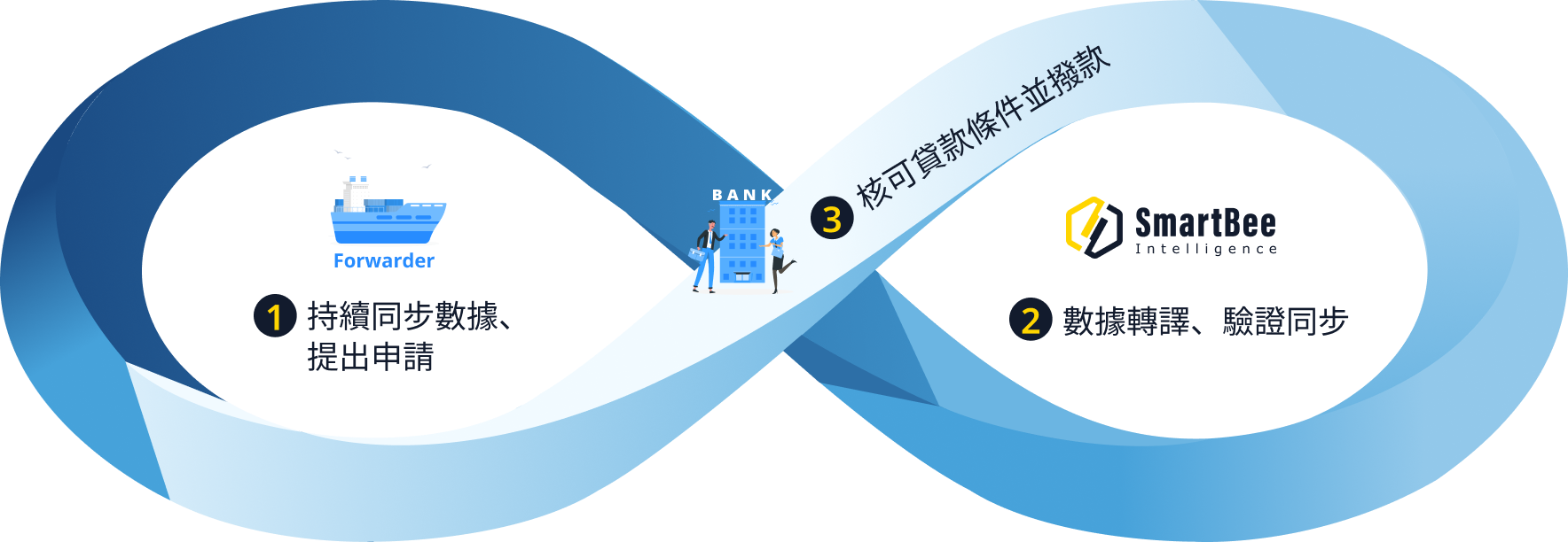 1.匯入完整的歷史資訊/2.Smart Capital解析您主要往來客戶的穩定性/3.SmartBee解析後的物流大數據,讓銀行給您較佳的條件